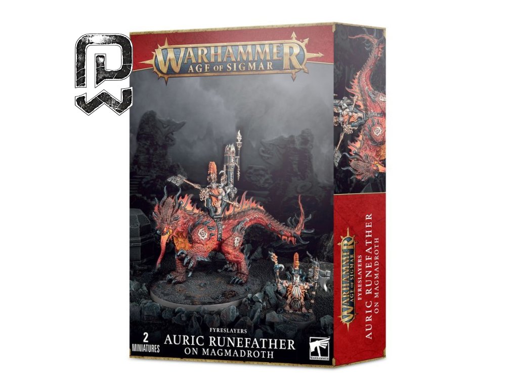 Auric Runefather je nejvyšší válečník Fyreslayerů, který vede své bojovníky z hřbetu Magmadrothu – obřího plamenného tvora. Jeho zbraň, latchkey grandaxe, dokáže rozsekat i ty nejtvrdší protivníky, zatímco Magmadroth ničí nepřátele svými drápy a ohnivým dechem.