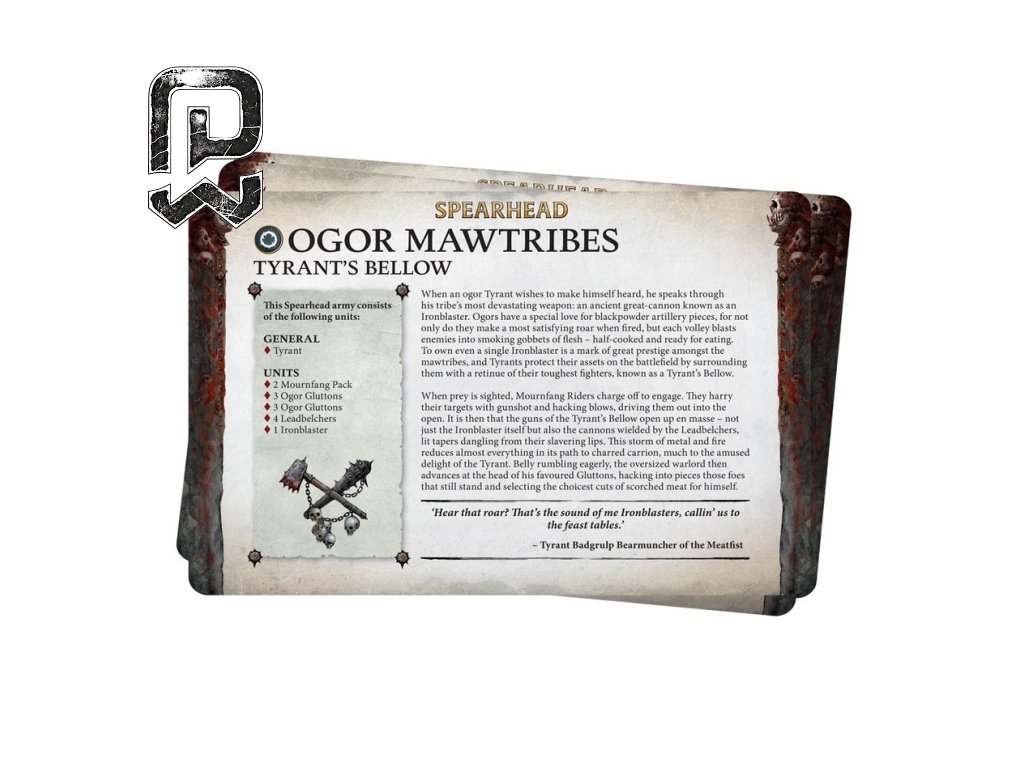 Ogor Mawtribes jsou brutální a nenasytní válečníci, kteří se pohybují po Mortal Realms a zanechávají za sebou cesty zkázy. Jejich síla spočívá v obrovské fyzické odolnosti, ničivých útocích a schopnosti čerpat nadpřirozenou energii z posvátných kotlů Mawpot.