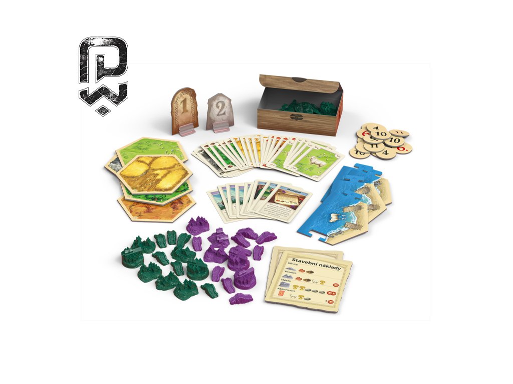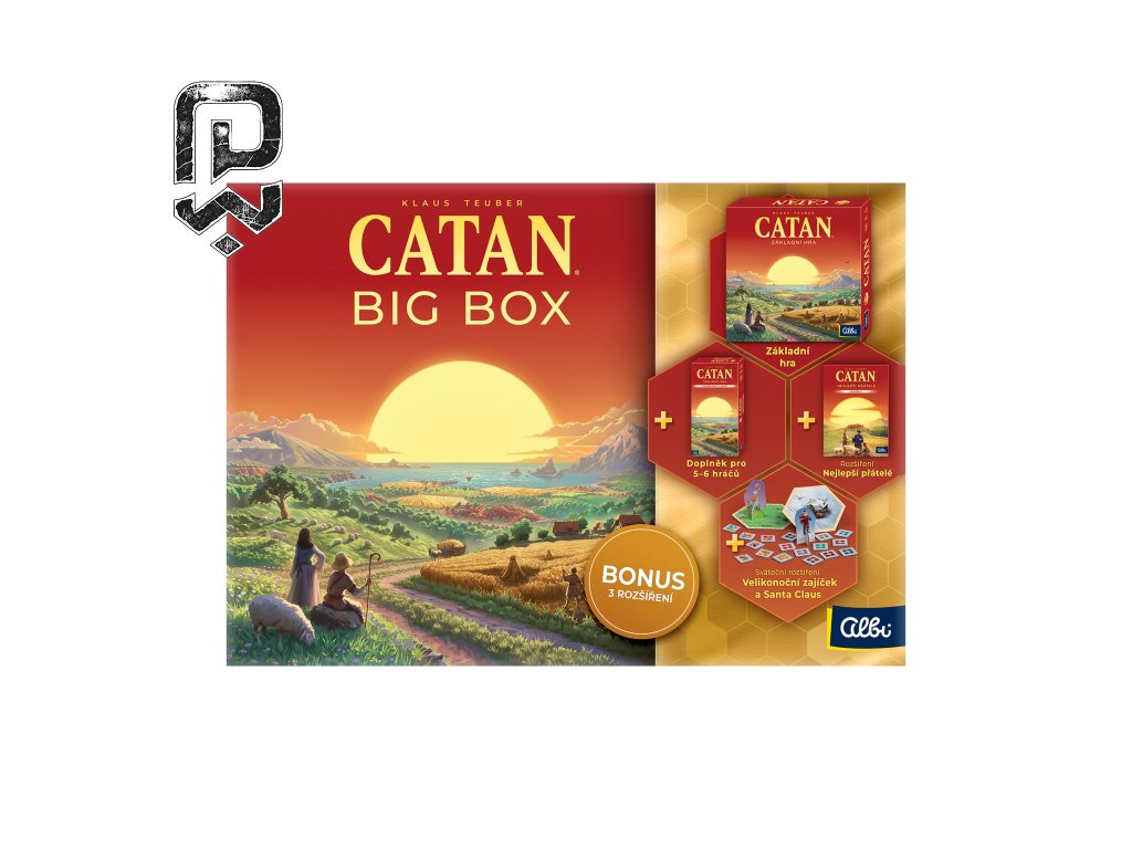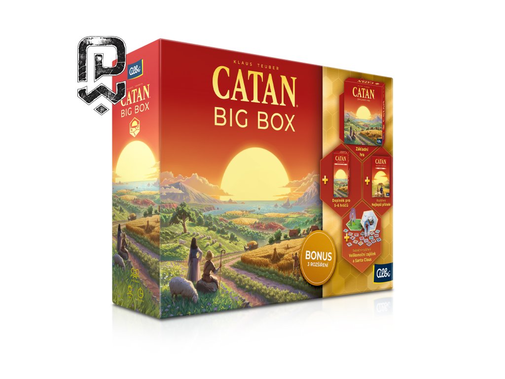 Big Box obsahuje: Základní hru Catan - 6 dílů rámu, 19 dílů krajin, 16 měst, 20 vesnic, 60 silnic, 18 žetonů s čísly, 1 zloděje, 2 kostky, 4 přehledy stavebních nákladů, 2 destičky mimořádných bodů, 25 akčních karet, 95 karet surovin, 2 pořadače na karty, 4 krabičky na figurky, CZ a SK pravidla. Doplněk pro 5 – 6 hráčů - 11 dílů krajin, 4 díly rámu, 28 žetonů s čísly, 2 přehledy stavebních nákladů, 25 karet surovin, 9 akčních karet, 48 hráčských figurek, 2 kartonové "kameny" s podstavci, 2 krabičky na figurky.