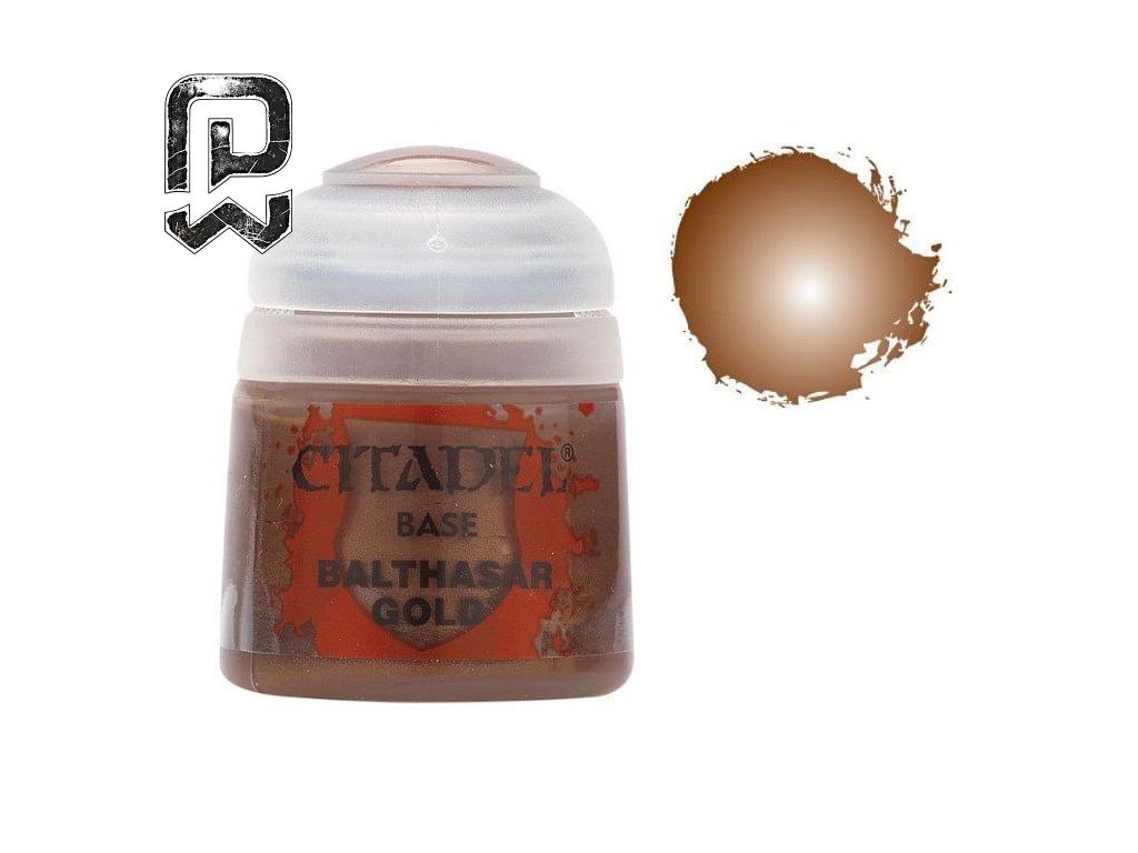 Citadel Base: Balthasar Gold je základní metalická barva vhodná pro rychlé nanášení krycího bronzovo-zlatého odstínu. Nabízí vysokou pigmentaci, silné krytí a hladký metalický povrch.