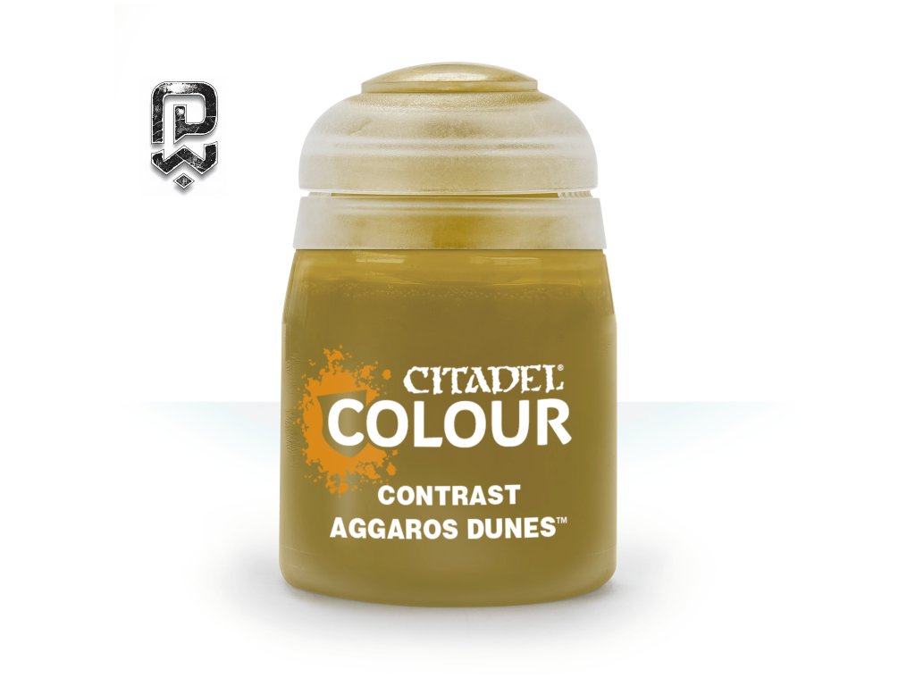 Aggaros Dunes patří do řady Citadel Contrast a vyznačuje se teplým pískově hnědým tónem s jemným zlatavým nádechem. Barva při aplikaci přirozeně stéká do prohlubní modelu, kde vytváří měkké, ale čitelné stíny, zatímco vystouplé plochy zůstávají světlejší. Je ideální pro realistické ztvárnění kůže, kostí, lebek, pergamenů, plátěných oděvů i pouštního terénu.