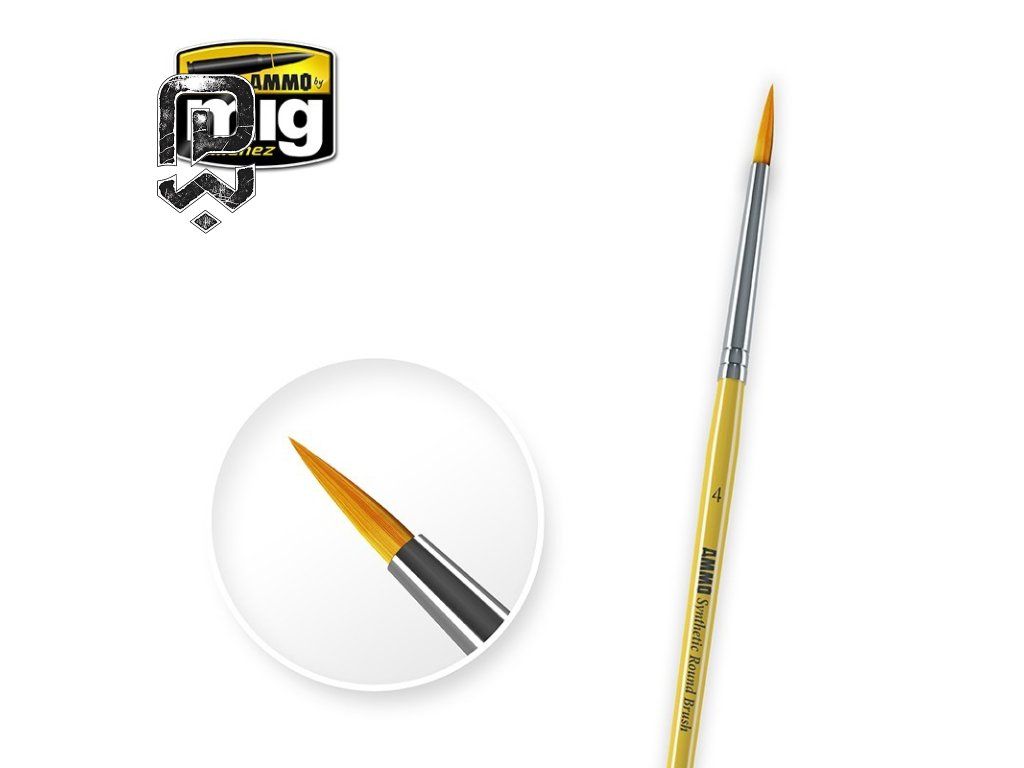 4 Synthetic Round Brush is a Set of synthetic round detail brushes for precision modeling work suitable for Perfect for fine detailing, panel line work, controlled washes, and reaching tight spots where larger brushes either flood the area or simply cannot reach without ruining nearby details. Fine synthetic fibers that keep their point even after repeated use, smooth paint release without sudden blobs, and stable control for precise strokes even with diluted acrylics. Painting tiny details on figures, adding weathering in recessed panel lines, controlled application of washes, and fixing small paint mistakes without touching surrounding areas.