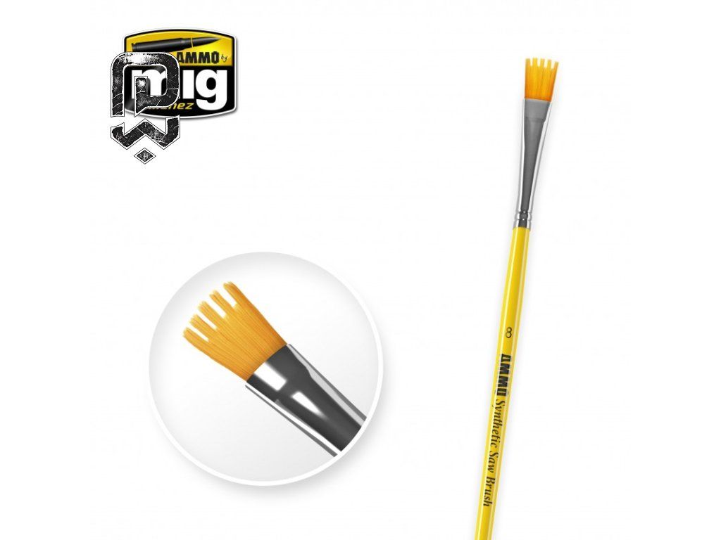 8 Synthetic Saw Brush Set AMMO by MIG is a synthetic hobby brushes designed for weathering, texture work, and controlled paint effects suitable for used for creating scratches, streaking grime, dry brushing, rust effects, and controlled weathering on scale models. stiff synthetic fibers shaped for aggressive texture work, consistent stroke control, no bristle splaying, stable paint delivery even under pressure. simulating chipped paint on armor edges, drawing rust streaks on vertical surfaces, applying directional wear on aircraft panels, creating dry-brush highlights on rough textures.