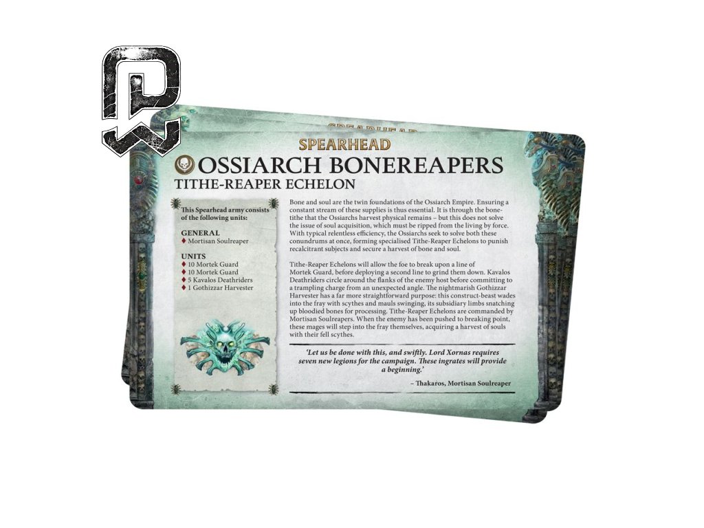 This card pack provides a complete overview of the rules, abilities, and units of the Ossiarch Bonereapers. It serves as a quick reference on the battlefield and during army preparation, allowing players to easily manage the Bone Tithe and lead their legions to victory.