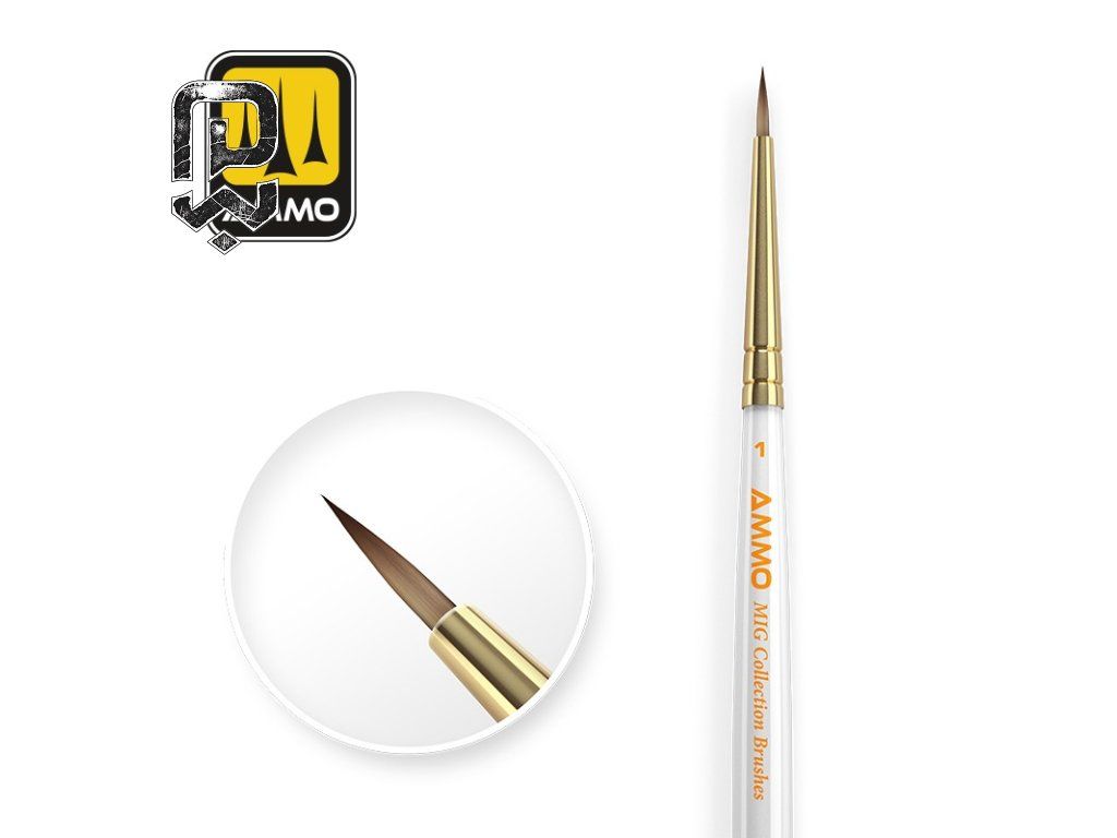 AMMO MIG Collection Brushes Conical Ø1 is a conical detail modeling brush Ø1 for precision painting suitable for for ultra-fine detailing on plastic models, controlled paint application in tight areas, panel lines, small chips, and precise touch-ups where larger brushes would ruin surrounding detail. conical tip that naturally pulls into a sharp point, stable bristles that keep their shape even after repeated use, allows precise micro-control without paint spreading uncontrollably. cockpit detailing, fine edge chipping, panel line washes, painting small rivets and bolts, fixing tiny paint errors without repainting surrounding areas.