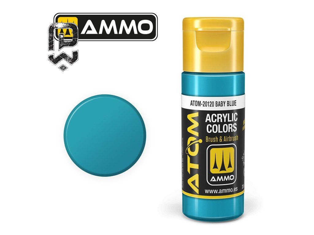 ATOM COLOR Baby Blue is an acrylic model paint suitable for painting miniatures, vehicles, terrain pieces, and detailed hobby projects. It provides strong pigmentation, smooth coverage, and an even matte finish.