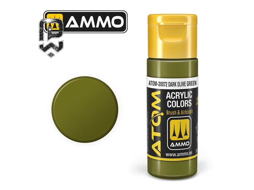 ATOM COLOR Dark Olive Green (FS34130) is an acrylic model paint suitable for painting military vehicles, equipment, and camouflage patterns. It provides a balanced tone, high coverage, and smooth application.