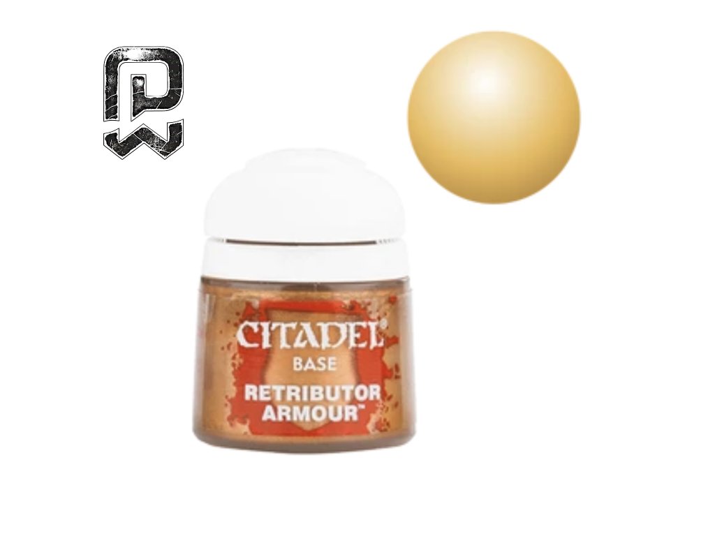 Citadel Base: Retributor Armour is an acrylic metallic base paint suitable for quick, clean application of vibrant gold surfaces. It provides excellent coverage, smooth application, and an intense gold shine in a single coat.