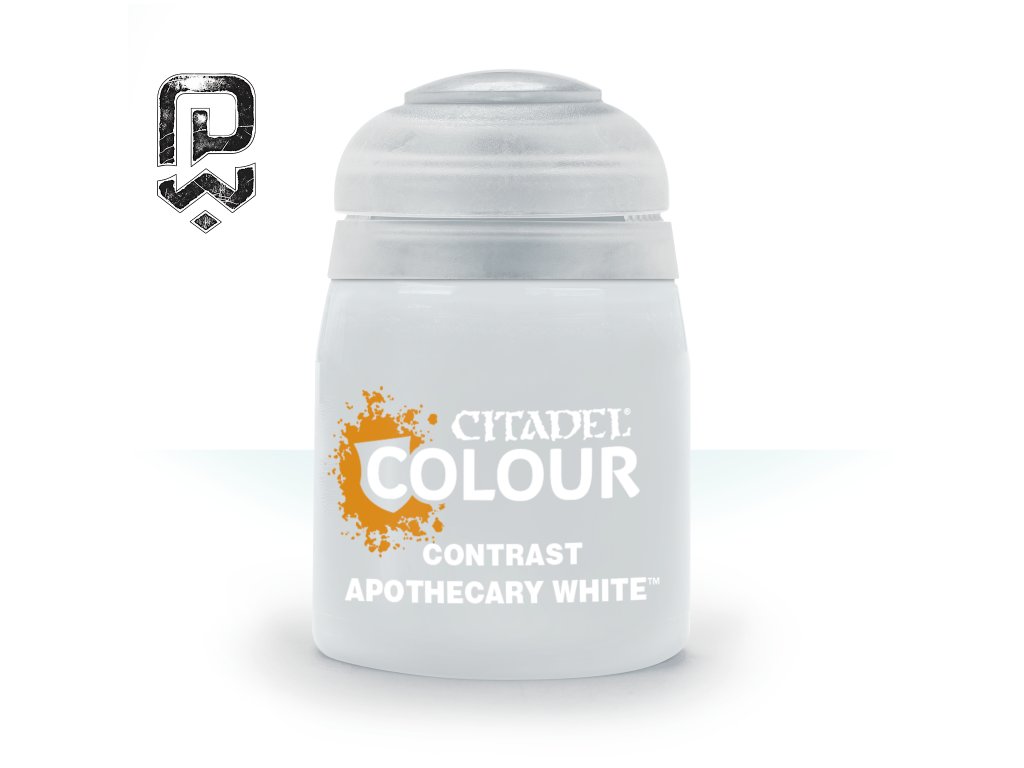 Citadel Contrast: Apothecary White is a contrast paint ideal for fast and controlled shading of white and very light areas. It creates soft grey shadows without dirtying the base colour.