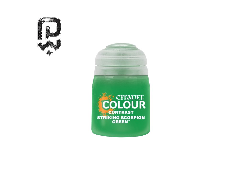 Citadel Contrast: S/SCORPION GREEN is a Contrast-type acrylic paint suitable for Eldar armor, energy weapons, technical details, and organic surfaces. It allows fast application with shading and highlights achieved in a single step.