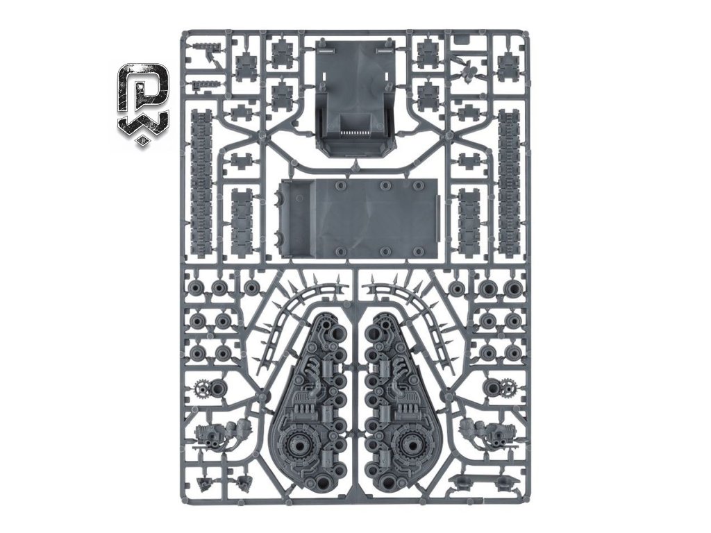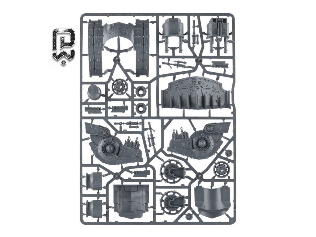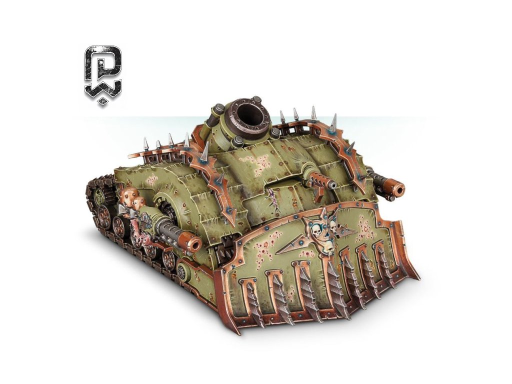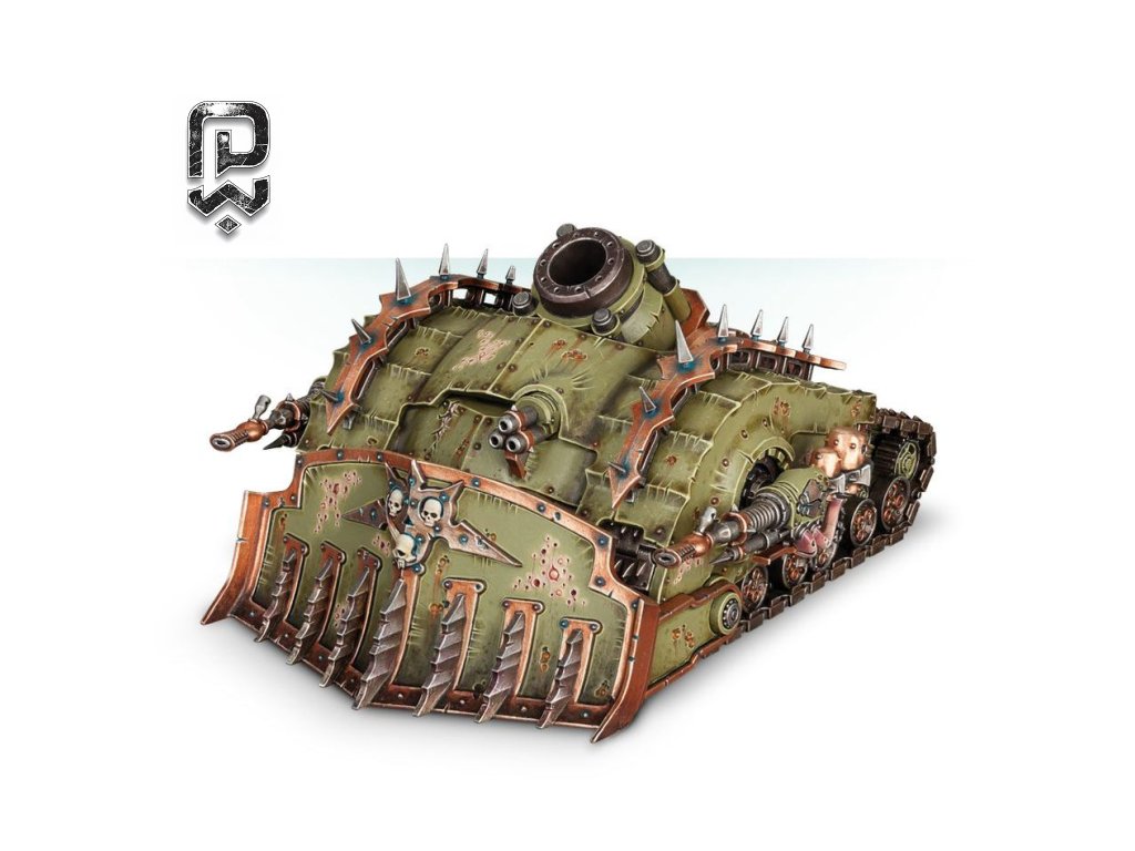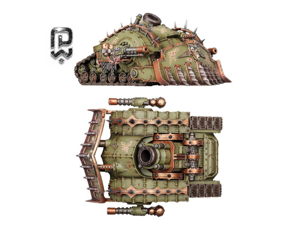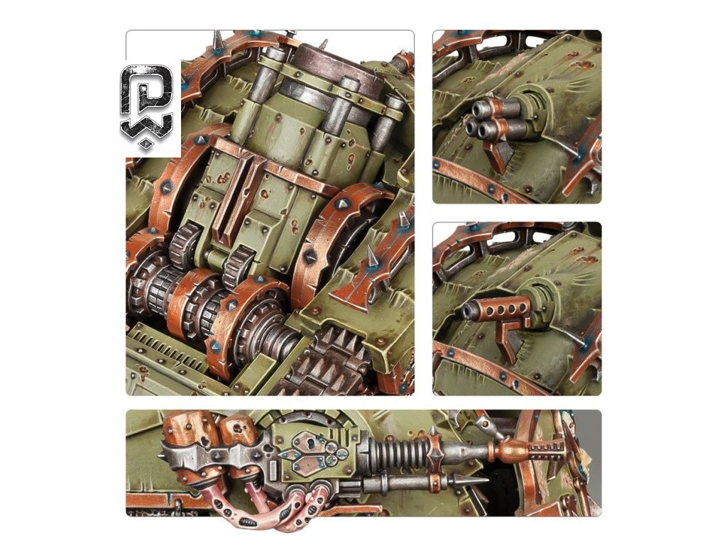 The Plagueburst Crawler is a heavily armored daemon engine, notable for its massive dozer blade and corrosion-covered plating. Its primary weapon is the Plagueburst mortar, able to strike targets beyond line of sight. Sponson weapons can be fitted with plaguespitters or entropy cannons, while the hull can mount a heavy slugger or rothail volley gun.