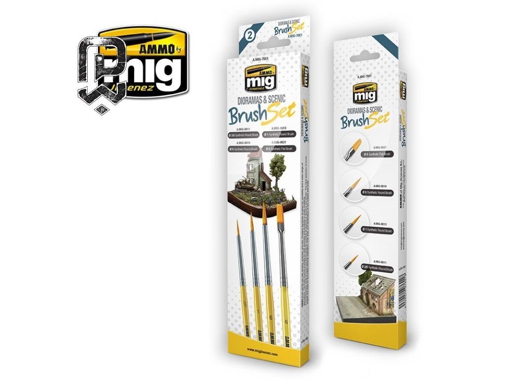 Diorama and Scenic Brush Set is a modeling brush set for terrain and scenery work suitable for terrain building, applying pigments, spreading glue, creating dust, mud, and scenic effects. tougher bristles for thicker materials, multiple shapes for coverage and detail, controlled application without splashing or mess. applying glue for static grass and scatter, working pigments into terrain, shaping mud effects, adjusting small scenic details.