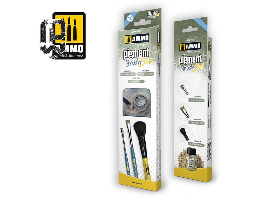 Pigment Brush Set A.MIG-7610 is a modeling brushes designed for controlled pigment and weathering application suitable for applying dry pigments for dust, rust, mud, and subtle weathering effects without scattering material over unwanted areas. soft but controlled bristles for precise pigment placement, different shapes for both fine detailing and broader weathering, stable tip that keeps its form during use. adding dust to tank tracks, blending rust streaks on armor, weathering aircraft panels, creating realistic dirt build-up on dioramas.