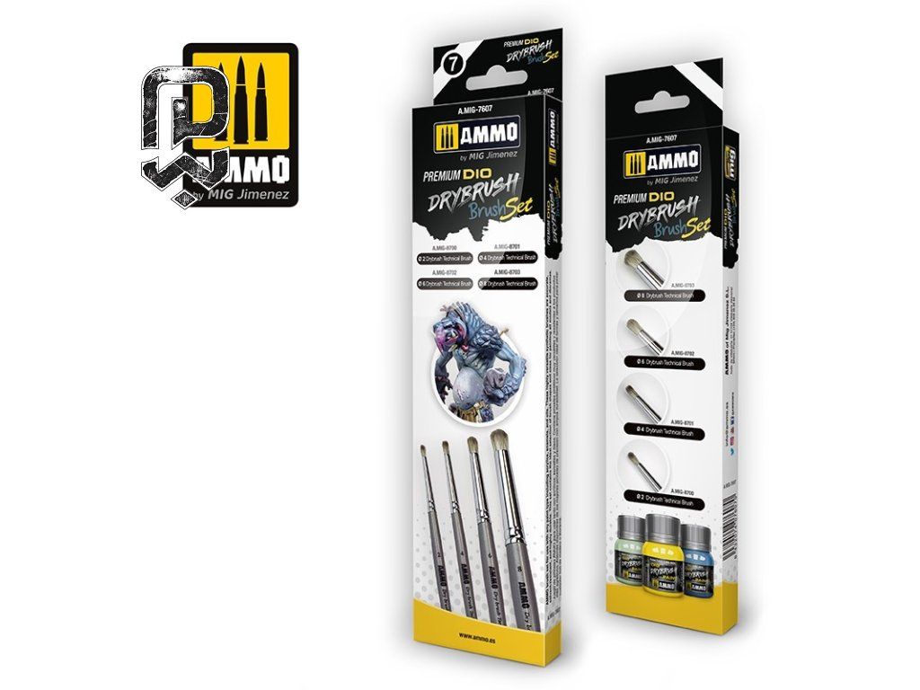 Premium Dio Drybrush Set is a drybrush brush set for weathering and detailing suitable for for controlled dry brushing on edges, raised details, textures on armor, dioramas, figures, and terrain where you want highlights without flooding recessed areas. specially shaped bristles that hold pigment only on the tips, optimized stiffness for controlled dry brushing, consistent paint release that prevents accidental streaks or pooling. highlighting chipped paint on tanks, emphasizing brick and concrete textures, picking out bolts and rivets, creating worn edges on sci-fi panels, bringing out fabric folds on figures.
