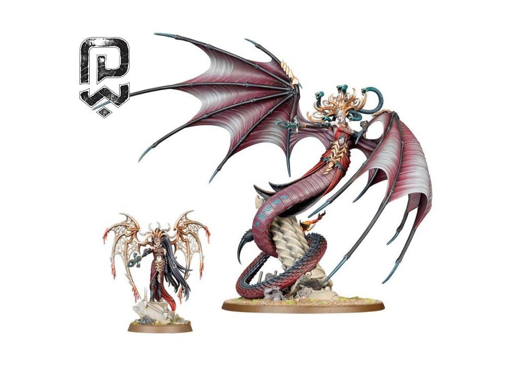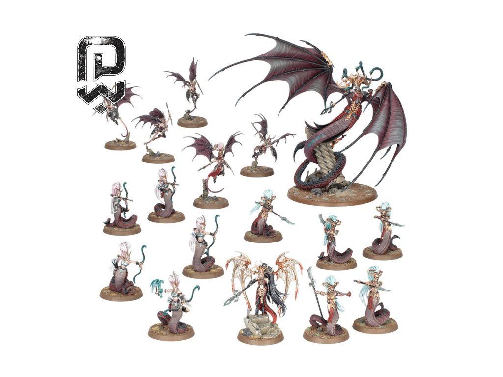 This battleforce is built around the Scáthborn side of the Daughters of Khaine range, bringing together Morathi-Khaine’s serpentine and winged servants in one dramatic collection. Inside you get the monumental presence of Morathi-Khaine and the Shadow Queen, supported by swift Khinerai and dangerous Melusai. The result is a box that feels strong in game terms, visually unforgettable, and highly collectible.