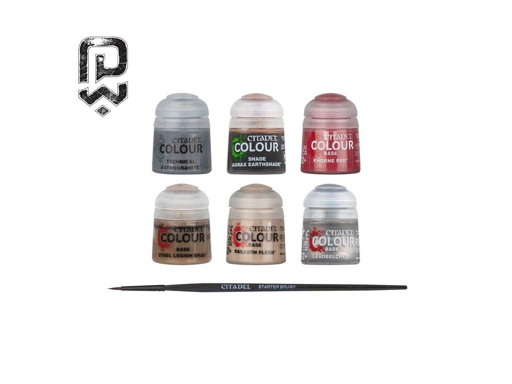 | 6× Citadel Paints (12 ml) | Khorne Red, Rakarth Flesh, Steel Legion Drab, Leadbelcher, Agrax Earthshade, Astrogranite. |
