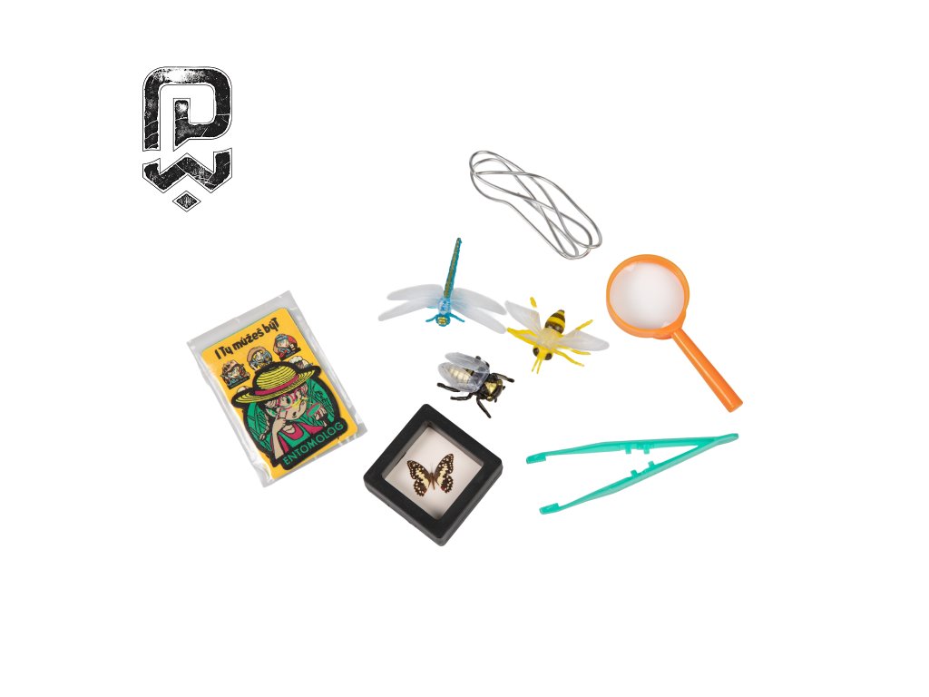Sada obsahuje: 3 modely plastového hmyzu, 1 pinzetu, 1 lupu, 1 stojánek na vystavení, 1 drát, 3 studijní karty, 1 nášivku Entomologa, návod.