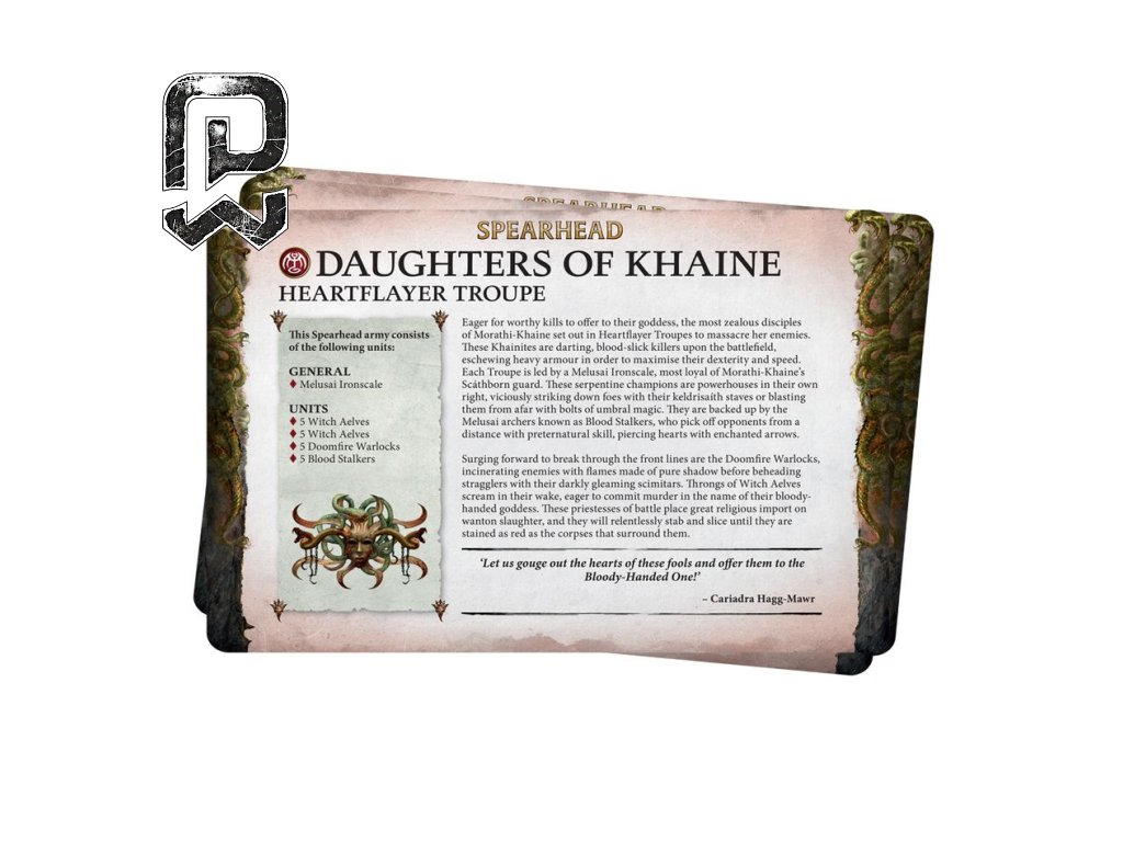 Daughters of Khaine – Warscroll Cards (Age of Sigmar) – vydaná v roku 2024, veľmi obľúbená medzi fanúšikmi Daughters of Khaine. K sade je potrebné: základné pravidlá Age of Sigmar, kocky, meradlá, herná podložka a vlastná armáda Daughters of Khaine.