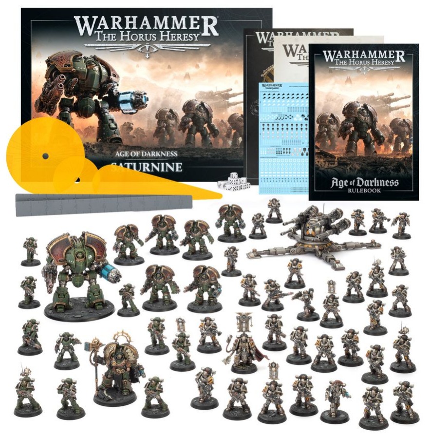 Veľký štartovací box pre Warhammer: The Horus Heresy (Age of Darkness) zasadený do éry Saturnine – masívny základ armády s 50 plastovými miniatúrami, hardback pravidlami a kompletným príslušenstvom na prvé bitky v 31. miléniu.