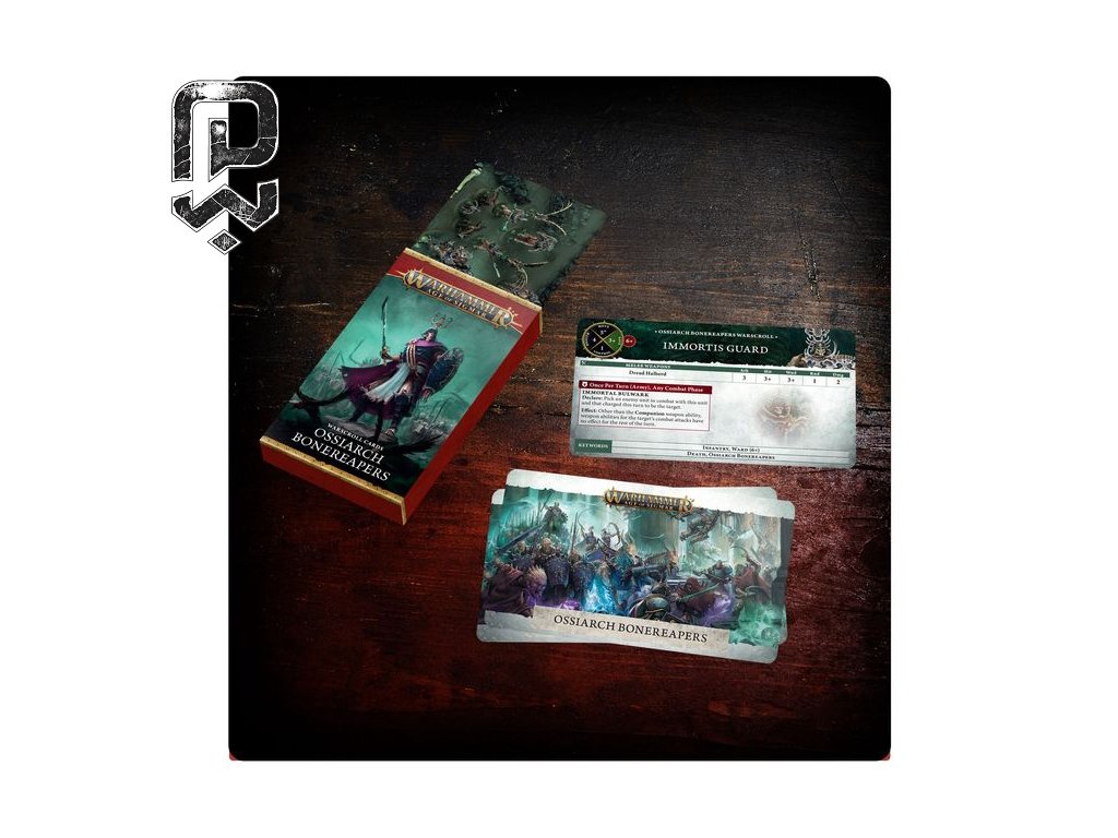 | Warscroll karty jednotek | Profily pro jednotky Ossiarch Bonereapers – rychlá reference na statistiky, zbraně a schopnosti přímo během hry. |